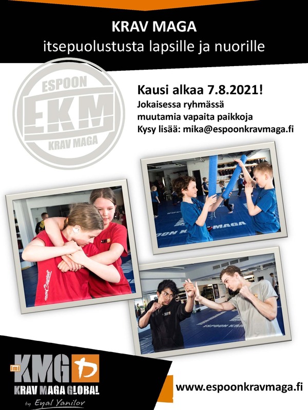 Entry into junior groups? It is possible to join next time in January. Kausi alkaa lauantaina 7.8.2021. Ryhmät Kids (5-7 v), Young (8-10 v), Junior (11-13 v) ja Teens (14-17 v) Päivitys: Ryhmiin ei oteta enää syyskaudelle uusia harjoittelijoita. Voit tulla kokeilemaan veloituksetta pari kertaa ennen päätöstä jatkosta. Kysy lisää vapaista paikoista: mika @ espoonkravmaga.fi tai jonna @ espoonkravmaga.fi Vallitsevan koronatilanteen vuoksi harjoittelemme ainakin kauden alussa ulkona Tapiolan Tennispuiston pihalla. Lue lisää junioritoiminnasta: Krav Junior - Season will start on Saturday 7.8.2021. Groups: Kids (5-7 y), Young (8-10 y), Junior (11-13 y) and Teens (14-17 y) Update: Autums season groups are closed. Because of the current covid situation we will train outdoors (at the area of Tapiolan Tennispuisto) at least in the beginning of the season. First two trial lessons are free of charge and after trials you can decide if you want to continue the whole Autumn season. For further information: jonna @ espoonkravmaga.fi |