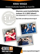 Ask for free places in junior groups on Spring season Otamme uusia harjoittelijoita mukaan 21.1.2023 alkaen! Kids (5-7 v) ja Junior (11-13 v) -ryhmissämme on joitakin vapaita paikkoja kevätkaudella 2023. Voit tulla kokeilemaan veloituksetta pari kertaa ennen sitoutumista loppukauteen. Paikat täytetään kokeilujärjestyksessä. Kysy kokeilukertaa: jonna@espoonkravmaga.fi. New students are welcome starting from 21.1.2023! There are few free places in Kids (5-7 y) and Junior (11-13 y) groups on Spring season 2023. Two trial lessons are free of charge before engaging to full season. The place will be fullfilled in order of trials. Ask for a trial: jonna@espoonkravmaga.fi.